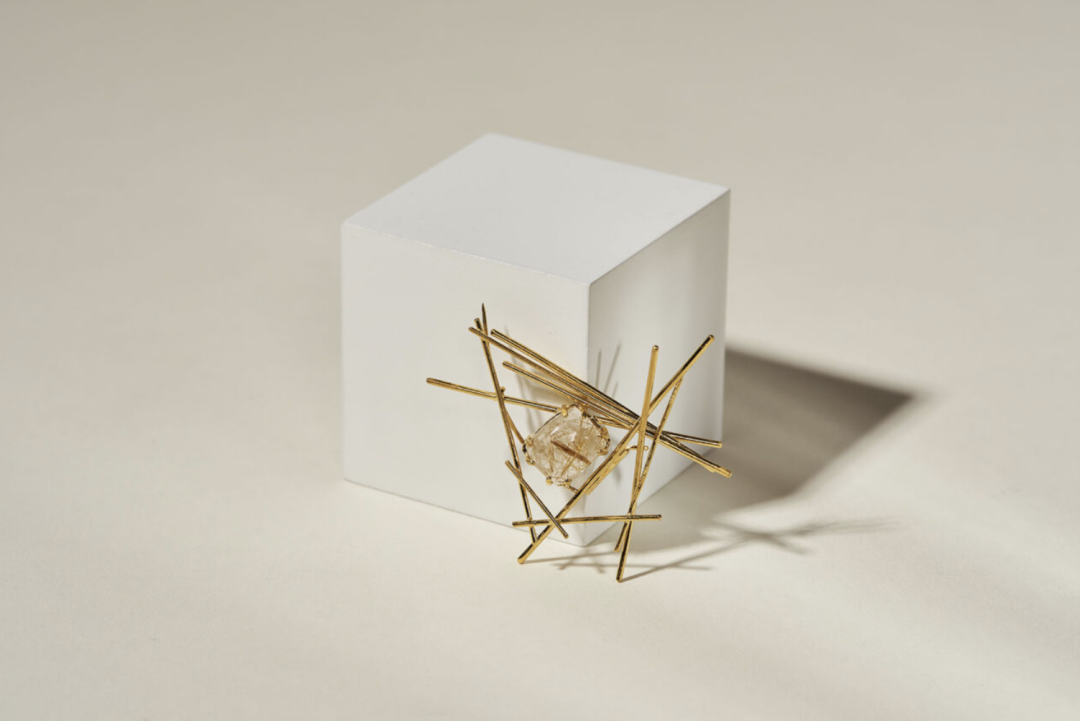 A brooch which is shaped as rutile inclusions, set with quartz.