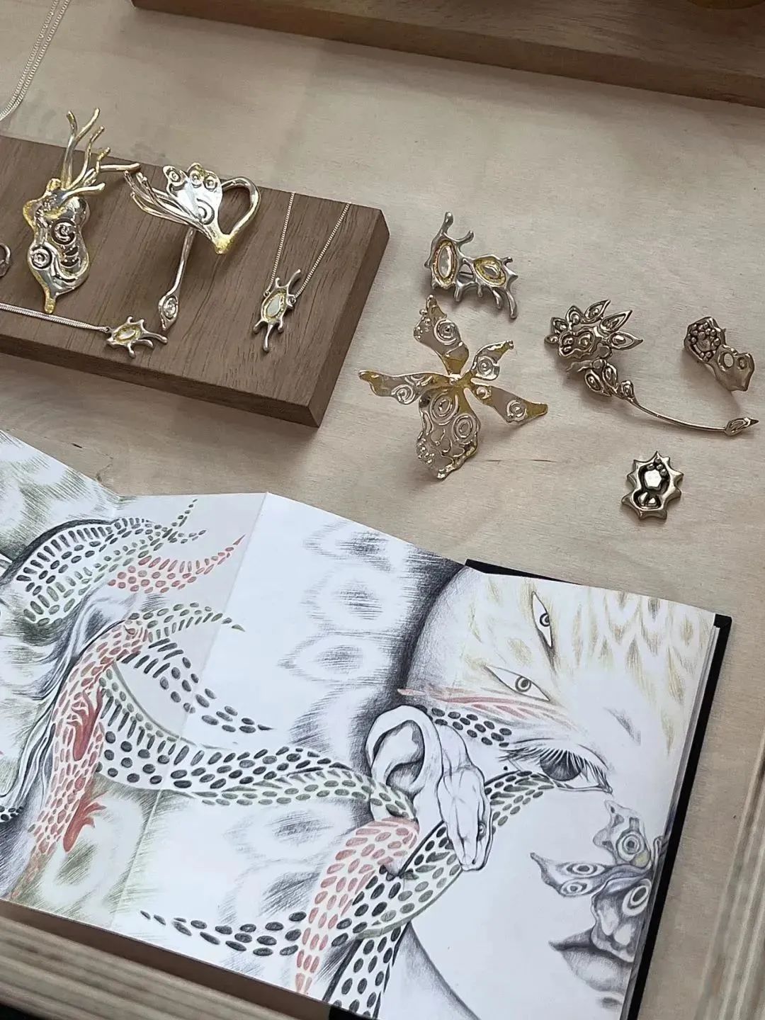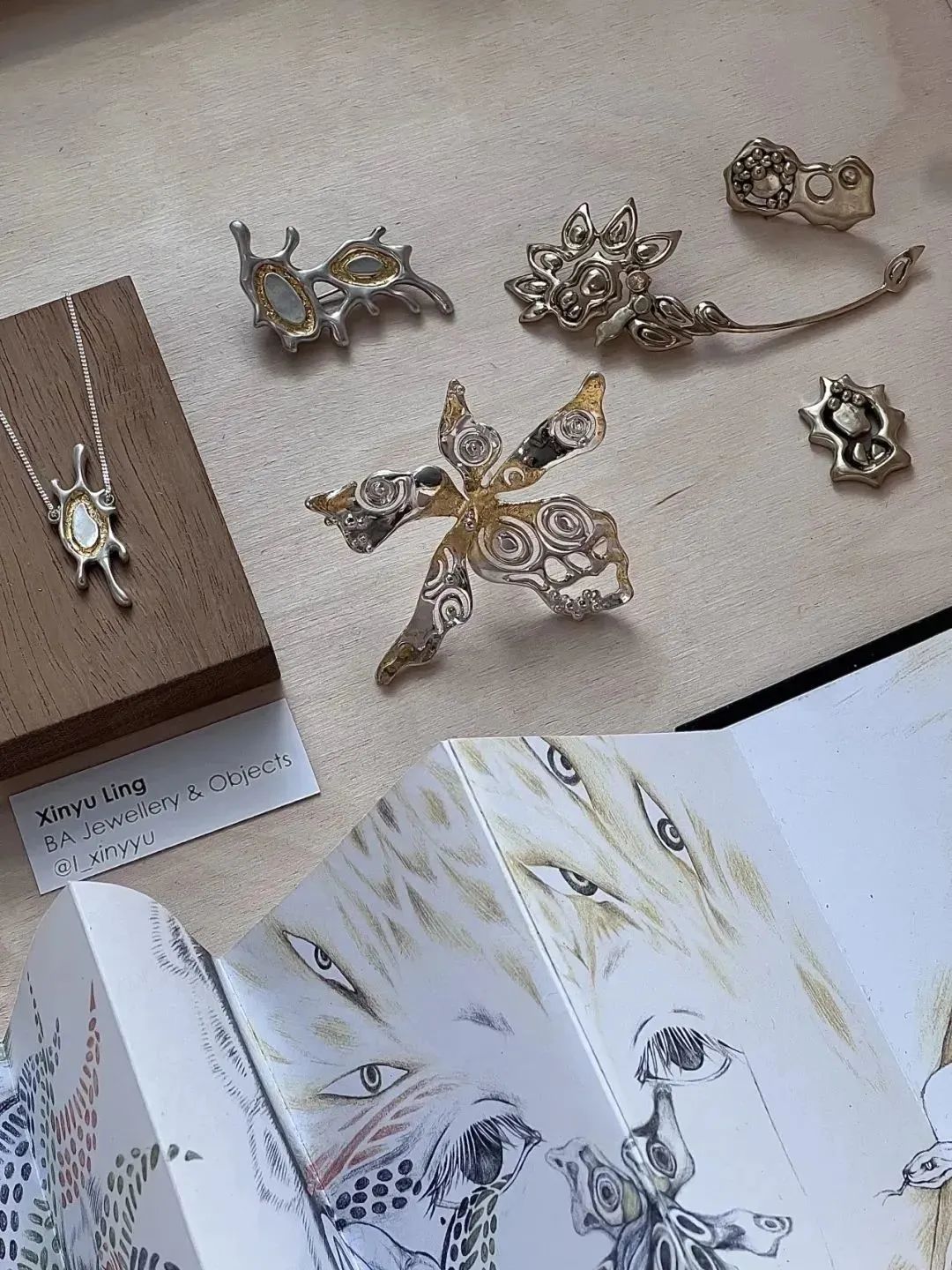 個人童年夢境中的可怕幻想激發了Xinyu的珠寶設計靈感。她通過夢境探索個體潛意識的誕生,將其作為隱藏空間的象征,由此延伸至集體潛意識的分形層面。Xinyu認為珠寶本身就是一個符號和代表。她使用彩色鉛筆來描述她的夢境和夢中經常出現的元素,這些敘事圖案構成了她無意識中的故事線索。