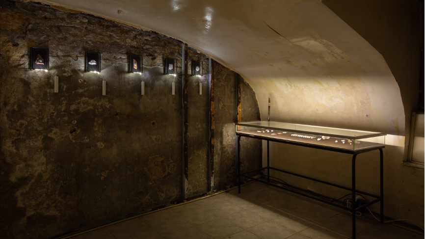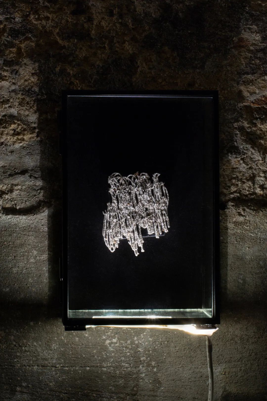 A:展覽布置花費了很多心思,因為我選的是地窖,給我提供了很大的展覽空間,但那只有一盞燈,十分昏暗。于是我決定干脆就全都暗下來,只照亮作品。一部分“考古碎片”陳列在玻璃桌里,也特意為一部分“保存完好的文物”制作了燈光展示盒,懸掛在墻上。引導(dǎo)觀眾的視線,也給整個空間營造了比較神秘的氛圍。