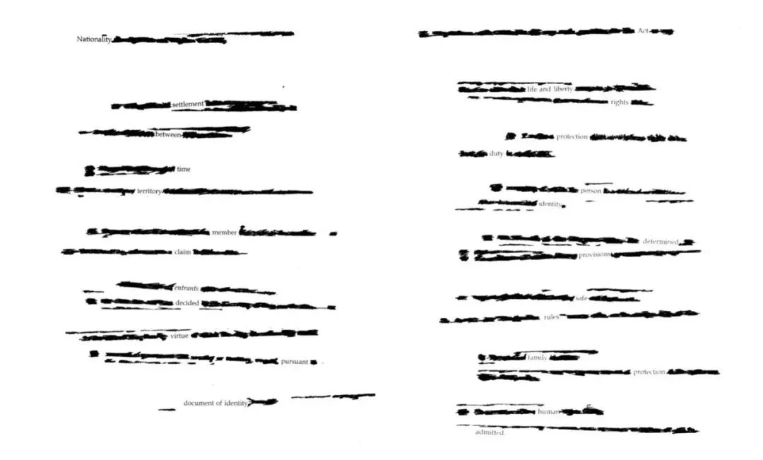 表演包括現(xiàn)場制作一條紙鏈項鏈,通過撕裂一份《非法移民法案》的紙質(zhì)副本制作而成。一部無聲的黑白電影(由藝術(shù)家創(chuàng)作)在中央舞臺上的大屏幕上播放。隨著電影的結(jié)束,一個即興作品被呈現(xiàn)出來,除了提到CLAW的實踐外,還引用了從《非法移民法案》中提取的文本創(chuàng)建的詩句。所生成的作品都是以和平的意圖進行的。