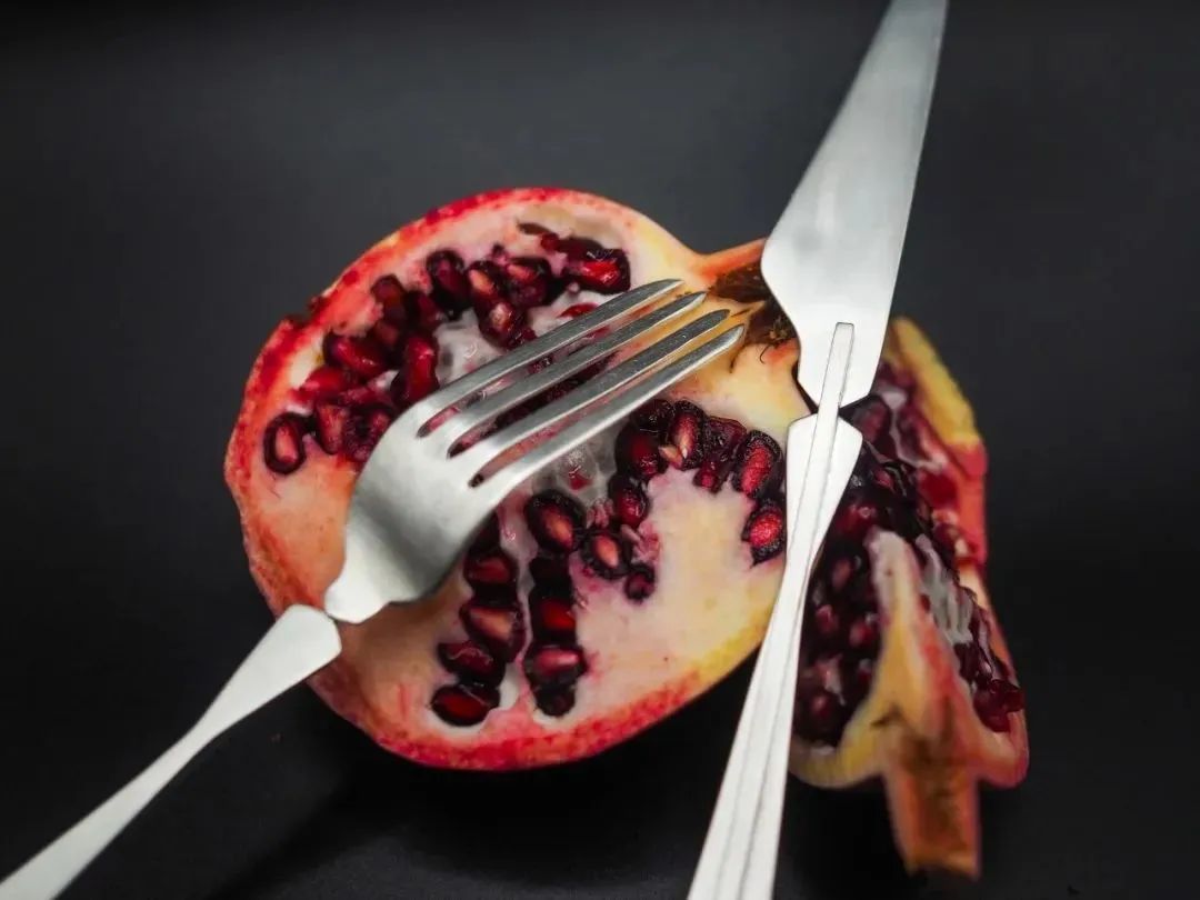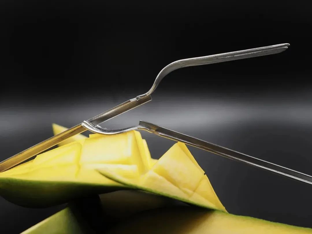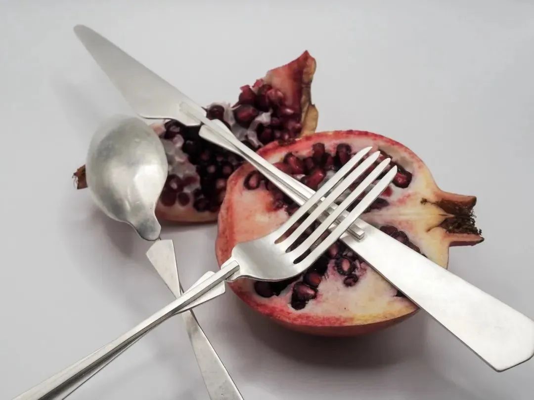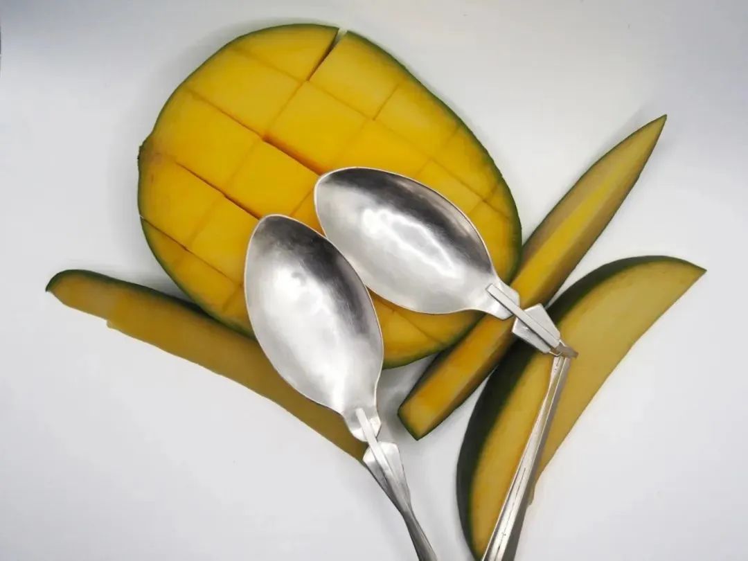 一個斷裂的湯匙插在一個芒果里,旁邊放著一個正常的湯匙。這些作品旨在在使用時制造挫敗感。叉子的叉齒會掉落,湯匙會坍塌,這些物體在憤怒和喜劇之間搖擺,創(chuàng)造了使用物體的人和只是旁觀的人之間的對比。