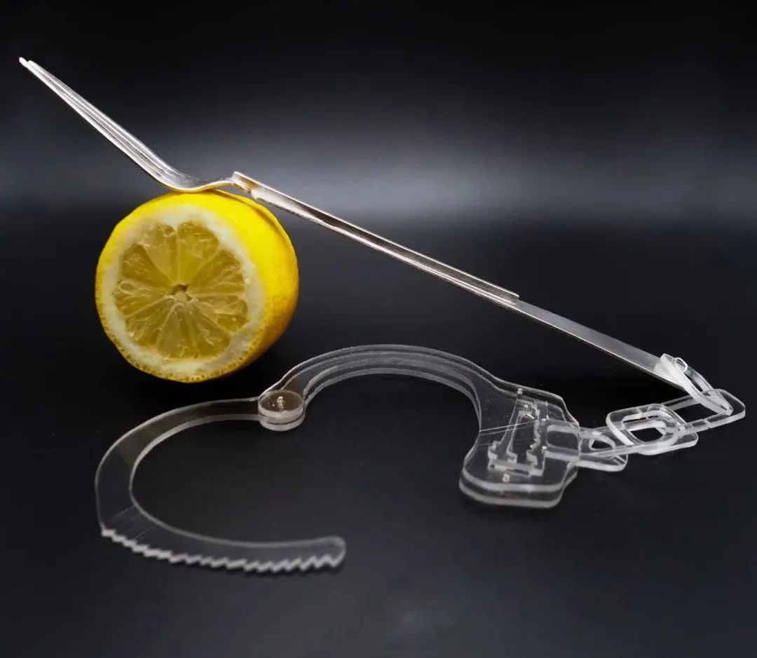 盡管這些作品處于餐具領(lǐng)域,由于透明亞克力的手銬部分,這些作品可以像手鐲一樣戴在手腕上。這設(shè)計意在評論焦慮感可能會讓人感到束縛和無休無止,因為沒有鑰匙它們很難被取下。然而,當戴上時,透明的手銬似乎消失了,強調(diào)了“只是在你腦海里”的觀念。