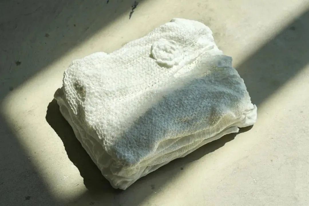 這件編織背心的結構充當了一個框架,讓空隙成為根系生長和通過根狀網絡加固結構的機會窗口。對于水芹來說,無論何處有空間,都有生命的可能性,不受羊毛框架的限制,邊界消失。空間現在可以被看作不是缺少某物,而是承載和保留未來所能提供的能力。無論發生什么,自然總會占據上風,填充空間,以再生、形態和活力來應對。