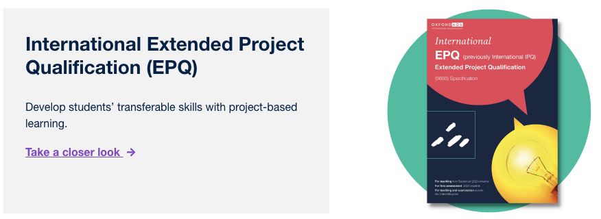 牛津AQA國際拓展項目資格(EPQ)是一種基于項目的資格(原IPQ),學生可以與他們選擇的國際AS / A-level一起參加。該資格證書幫助學生發展獨立學習技能,為大學及以后做好準備。這些技能包括研究、創造性解決問題和報告寫作。