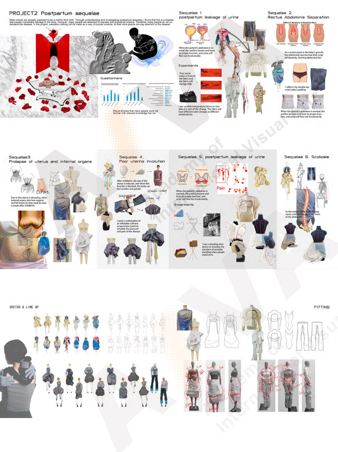 “事實上,大多數女性從一出生就被期望成為母親。但是通過對產后后遺癥的了解和調查,我發現這個過程會對身體造成不可逆轉的傷害。可很多人羞于表達,羞于科普這一點,所以很多人對這種疾病并不了解。在這個項目中,我們將制作可穿戴服裝作為一種科普方式,讓更多的人關注到產后后遺癥 ,包括產后漏尿后遺癥 、腹直肌分離、直腸膨出等等病癥。”