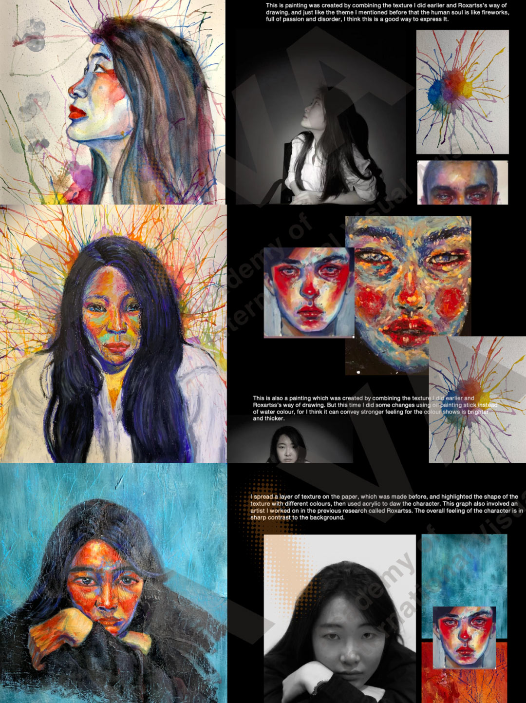 我選擇的第一種紋理是用水彩創作的,我用一支沾了很多水的畫筆,蘸上一些顏料,然后用力吹,讓水盡可能地流得更遠。第二幅作品是將一些墨水倒入裝有幾滴清潔劑的水杯中,然后用筷子蘸著這些混合物,用這種方法在紙上吹出氣泡。第三種是用油畫棒創作的。我先用刮刀刮掉一些顏色,然后用刮刀在油畫棒的碎片上畫出一般的繪畫方法。第四個和第五個紋理的制作過程是一樣的,我所要做的就是在一張用水粉顏料刷過的紙上放一張餐巾紙。