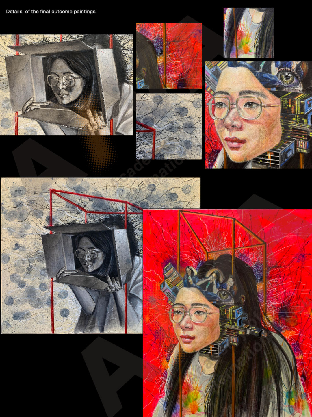 我把他的一幅作品作為我最終畫作基本結構的參考,但將其中的元素移植到了我之前的作品中。之所以選擇這幅畫作為我的資源,是因為藝術家所表達的那個人被困在盒子里,只向其他人展示面具,這與我想表達的意思很接近。這幅畫中還使用了不規則的線條,背景中的水色紋理也能帶來強烈的氛圍感。