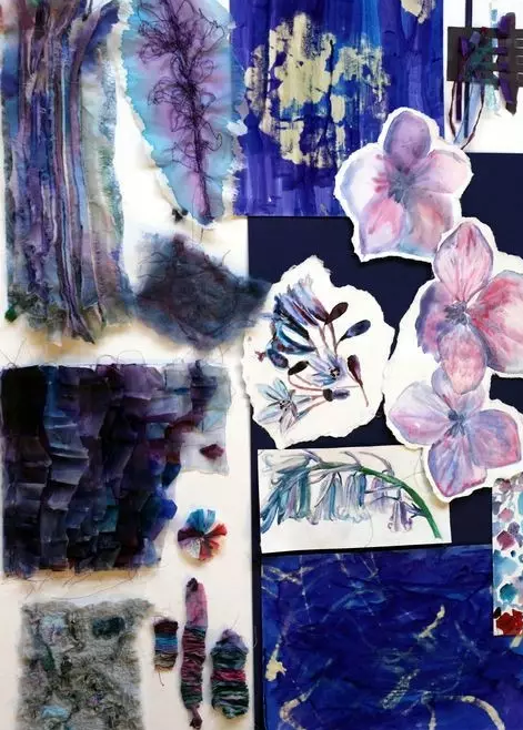 正式展示項目是從research 開始,包含所有靈感,keywords,利用圖片進行展現,是設計過程的第一步。大家可以看到下面這個案例,以花為主靈感源,進行observation drawing,提取花的色彩、元素,結合所需要的面料,進行一些面料改造,作為Research的第一步。