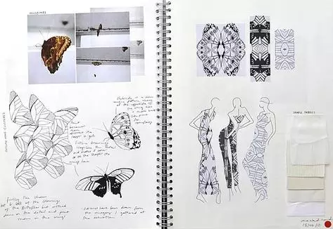 下面這個案例相對上圖,Research從服裝結構上加上靈感點(蝴蝶)。這個案例中可以看到學生運用文字和sketch結合的方式,來說明自己的研究過程。