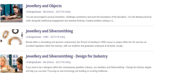 相對第一個注重創(chuàng)意的專業(yè);第二行的Jewellery and Silversmithing代稱HND(首飾與銀匠)這是一個大專學(xué)歷的專業(yè), 學(xué)時2年,它則是針對首飾基本制作與銀器制作為主的專業(yè),非常重視金屬工藝技巧。通過2年的學(xué)習(xí)成為相對傳統(tǒng)的首飾設(shè)計(jì)師,熟練運(yùn)用金屬工藝與銀匠工藝。