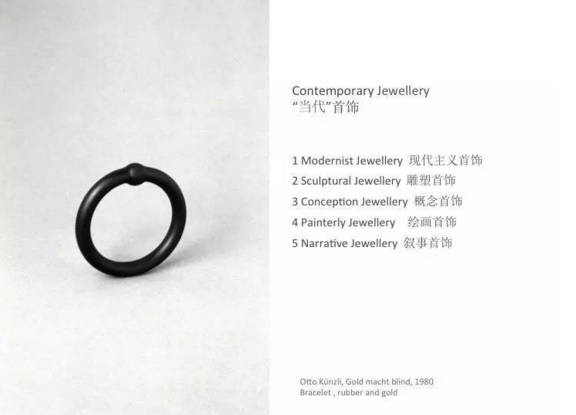 圖上左側(cè)的Otto Kunzli教授制作的戒指,他將純金的小球放在封閉的橡膠管內(nèi),掩蓋了貴重的部分,玩味佩戴者佩戴首飾的目的。這件作品挑戰(zhàn)著首飾存在價(jià)值;傳統(tǒng)的、單純使用貴金屬制造的首飾珠寶作品,它的價(jià)值其實(shí)大多停留在材料本身的價(jià)值,并沒有多少美學(xué)價(jià)值。所以為了發(fā)展美學(xué)、藝術(shù)創(chuàng)作的價(jià)值當(dāng)代首飾就在當(dāng)時的藝術(shù)思潮下理所當(dāng)然的誕生了。當(dāng)代首飾可以主要按靈感來源分為圖上的五個方面,但是很多時候一件作品可以同時是雕塑風(fēng)格的概念首飾,并不一定要有明確的分界。