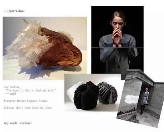 比如說這一頁就是我首飾作品《Opposed》的靈感來源圖例,在創(chuàng)作的初期我認(rèn)為有著強(qiáng)烈對比的物品能很好的吸引人們的注意力,都很有趣,所以我挑選了一些給我靈感的其他藝術(shù)家設(shè)計(jì)師的作品。如一般水晶一般面包的雕塑作品,水泥制作的服裝,紙制作的椅子等等。以此來告訴觀者我的靈感來源。