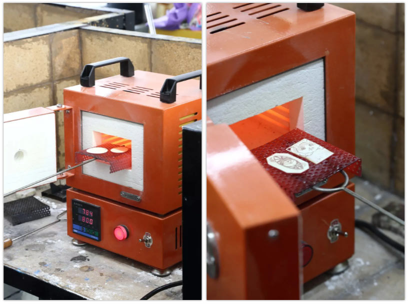 主要用于制作琺瑯燒造、制作琺瑯首飾以及琺瑯裝飾片。琺瑯還有所謂軟琺瑯與硬琺瑯之分,所以琺瑯區的設置要區別對待。琺瑯區主要配備高溫電爐、鋼砧、電熱風烤箱、工作臺、通風管道設備等。小型的工作室可能不必要配備燒制琺瑯的區域。