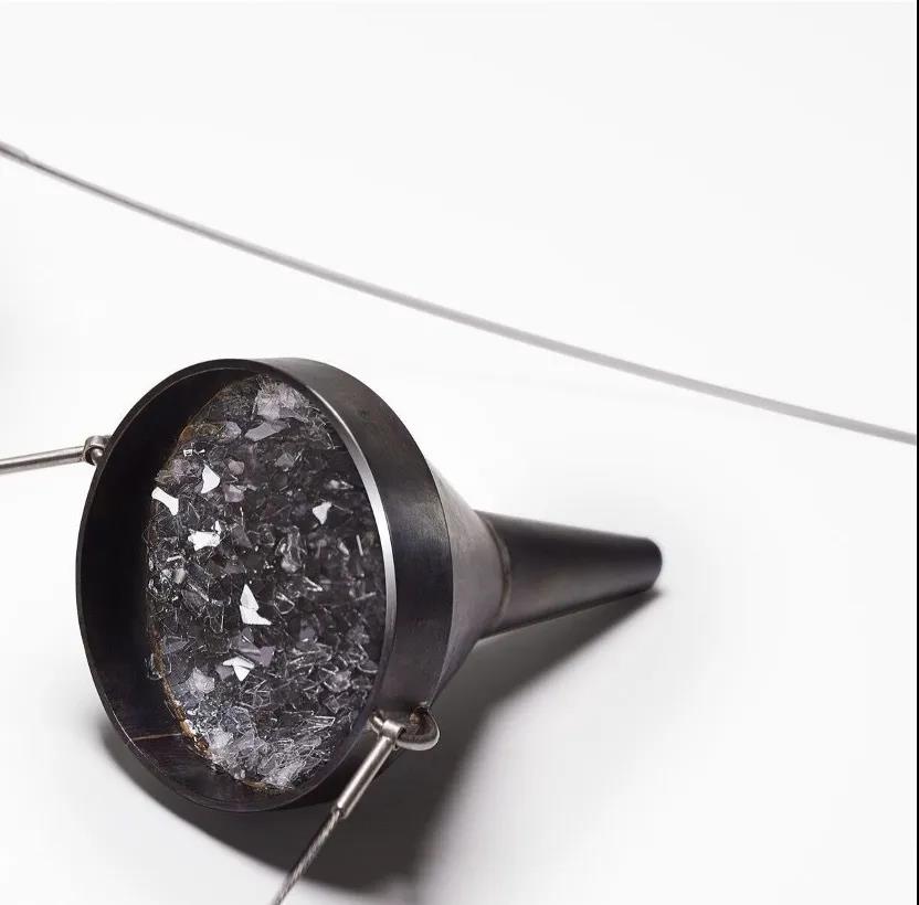 在她的作品中,我們可以看到脆弱的世界經過了修繕;看到破損、骨折;人類被共同的危險聚集在一起:這是一種美麗的破碎。作品外部結構采用實驗室工具一般嚴謹的結構,內部則揭示了折射玻璃碎片微妙與秘密的世界。光線輻射效果取決于每個碎片的方向,這使得光線變得忽明忽暗。