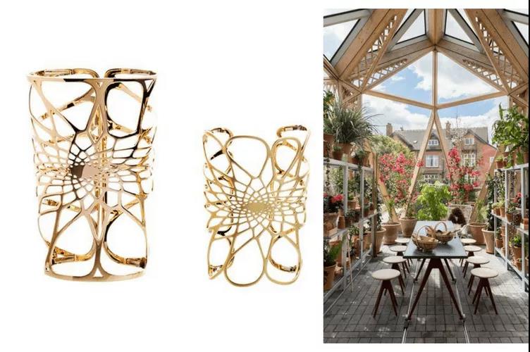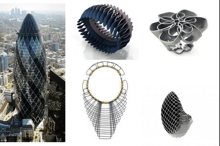 Zaha Hadid為House of Aziz & Walid Mouzamar設計的手鐲。圖右為Norman Foster為曼徹斯特醫院設計的癌癥病患居所。