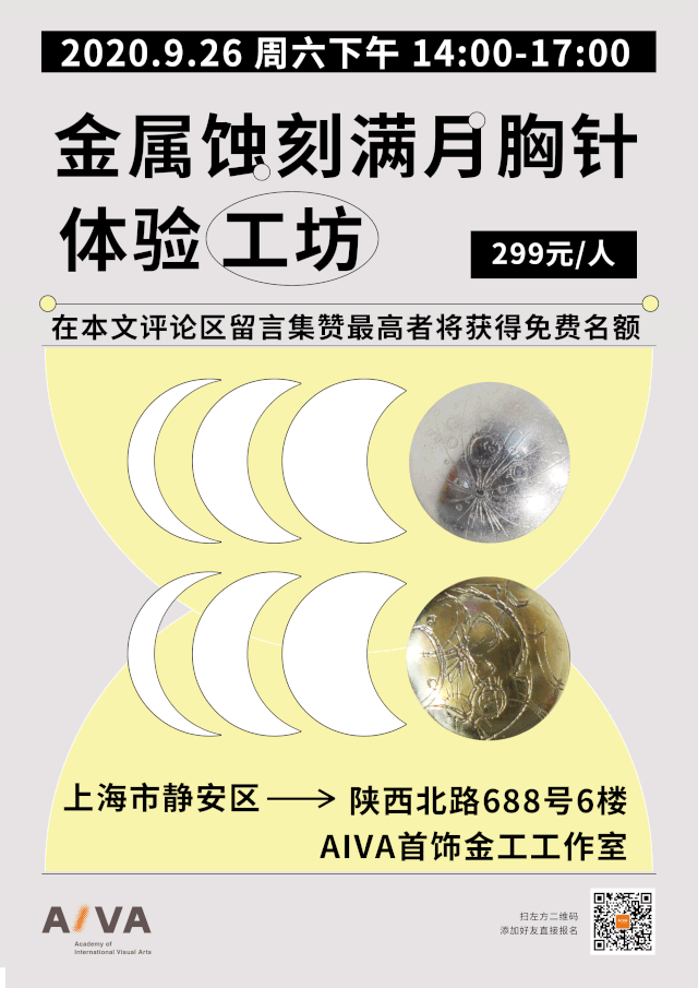 了解工坊詳情,請戳鏈接:中秋首飾體驗工坊 | 眸中的月光 - 金屬蝕刻胸針工坊