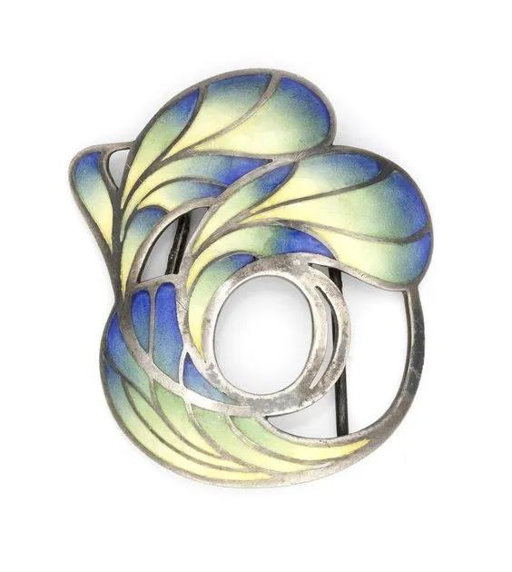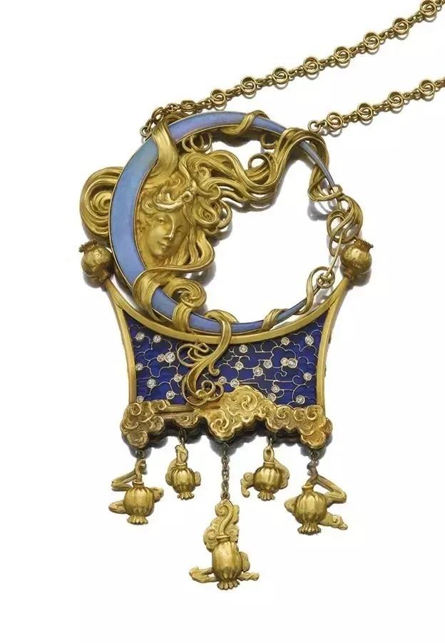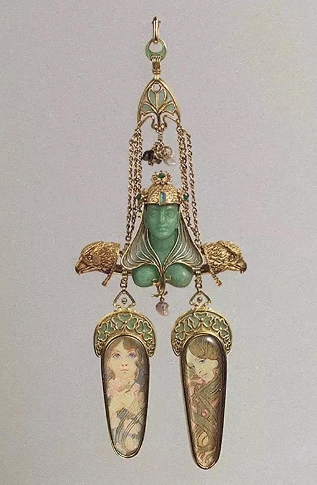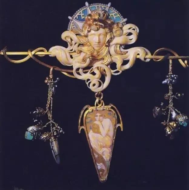 下面這支是穆夏創作于1900年的胸針,由黃金、象牙、琺瑯、珍珠和寶石等材料制成。現由私人收藏。