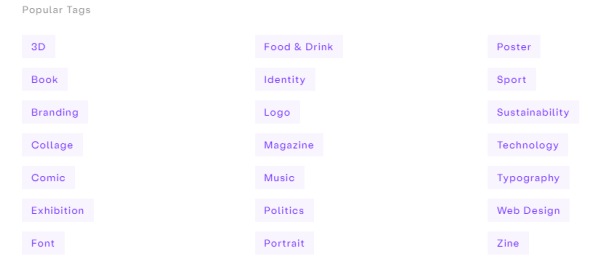 這些標簽涵蓋了從廣義學科(例如“圖形設計”和“攝影”)到作品的更具體媒介(例如“海報”、“ VR”或“雜志”)以及涉及到更廣泛主題的所有內容(例如“體育”、“技術”或“可持續性”)。