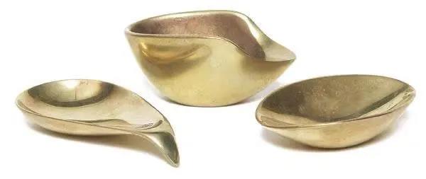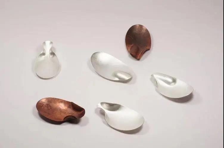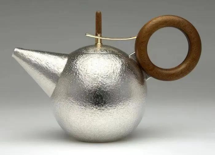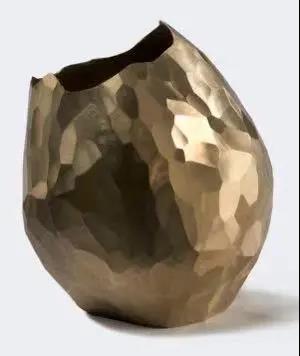 復雜的器物也可以使用錘揲法。如口小腹大的瓶子水壺類器皿,一般是分成上下兩部分錘揲,也可分為多個部分錘揲,最后將各部分焊接或鉚接一起,打磨光滑。不同于繁復的華麗之美,簡潔的器物本身,表面富有肌理的變化,使得金屬脫離了冷冰冰的質感,而多了人文的溫度。