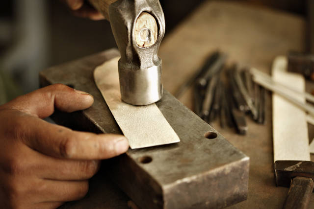 巧妙地借助錘子、鏨子、鐵鉆、折子、模型來使用,可以塑造出各種金屬的形態。選擇合適的錘子——錘子的形狀、大小、紋樣等因素會對金屬的成型產生決定性的影響。