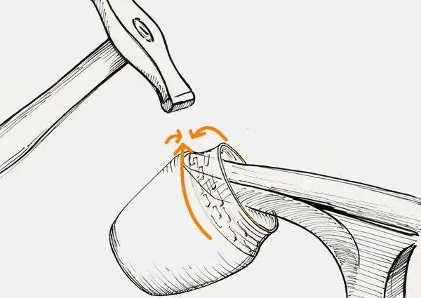 錘子或者窩鏨作用在金屬的力量可以使得器物造型向內或向外彎折變化。鐵鉆、木塊等金屬的背景墊底,或者是錘子,窩鏨等成形工具的使用也影響著器物成型。錘擊點的把握是金屬鍛敲成形時最為關鍵的重要控制,不同的敲擊點直接影響著成形。