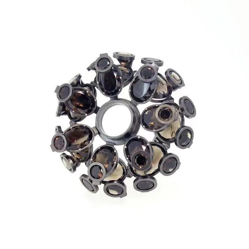 Kojima回看他的兩種過往——其一是他的母親收藏的古董珠寶,過去的時(shí)光幾乎觸手可及,另一部分則是他所處的現(xiàn)代社會(huì)。從2005年開始,他就開始在作品中使用寶石,因?yàn)樗X得寶石在很多世紀(jì)以來幾乎是所有首飾的核心,作為一種對比,他的設(shè)計(jì)是基于一種經(jīng)典的日本的當(dāng)代現(xiàn)象:漫畫和 anime(一個(gè)從英語“動(dòng)畫”衍生的詞)的巴洛克文化。Kojima的珠寶首飾仿佛從那些圖像小說中誕生,似乎是變形金剛角色的某種變形。這正是他的作品所能達(dá)成的:它們可以把不同的功能合并。一件作品通常由幾個(gè)可以分開佩戴的部分組成。這一點(diǎn)對Kojima說正是最關(guān)鍵的:他的首飾就是要可以佩戴。在這一點(diǎn)上來說,他打破了一個(gè)存在已久的阻礙,模糊了藝術(shù)與應(yīng)用美術(shù)之間的界限,以及高超工藝和日常用品之間的界限,這正是日本的精髓。”