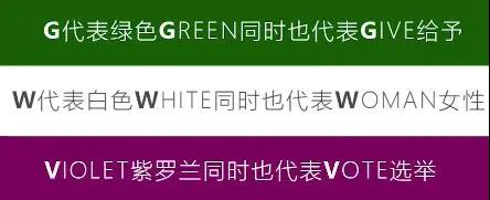 “在20世紀初的英國,女權運動的支持者決定使用綠色(Green)、白色(White)和 紫色(Violet)這三種顏色,作為她們?yōu)樽约籂幦≌螜嗬?ldquo;旗幟”。