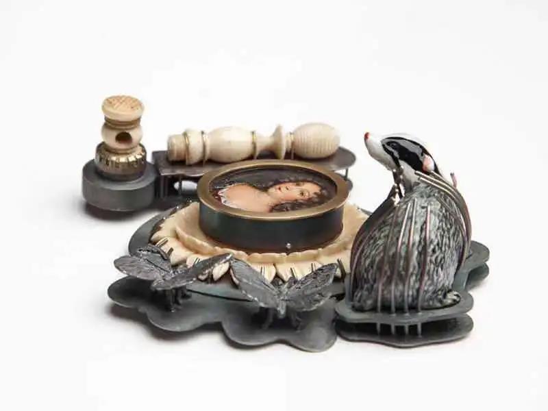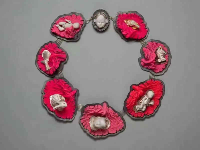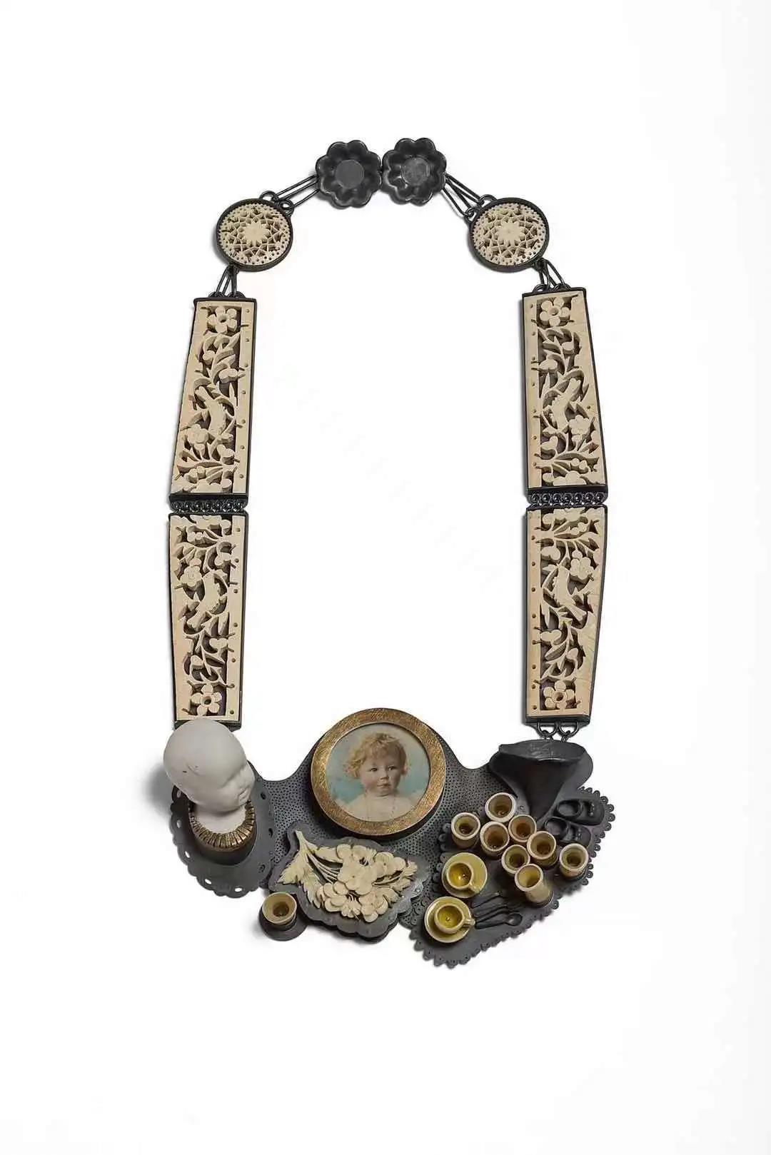 意大利首飾藝術家Barbara Paganin的作品大量地使用現有的物品來創作,通過主客觀時間關系的不斷交換,藝術家有效地檢驗了串聯起生活和每個人記憶的作品的價值。在《記憶》系列作品中,陶瓷動物、瓷娃娃、雕刻的象牙、森林、玻璃、出土、傳承和收集的舊照片的縮影與鞋子、衣服、日常使用的小工具和仿制寶石驚人混在一起。Paganin由此在作品中加持了層層的情感,在這個網中每個人都能找到自己的情感投射。每一枚胸針,每一條項鏈都在訴說一個故事,情節由我們來填充。