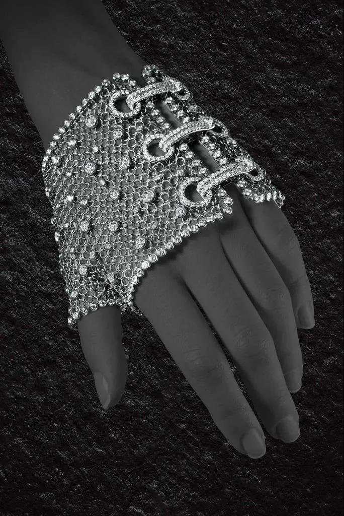 2013年,麥當娜(Madonna)在她的巡回紀錄片《麥當娜:MDNA Tour》首映儀式上戴著無指網(wǎng)狀白金和鉆石手套。這款引起關(guān)注的手飾可以說是她對早期(80年代)追隨她時尚的粉絲們的致意——這款手套仿佛是她標志性的蕾絲手套的奢華版。