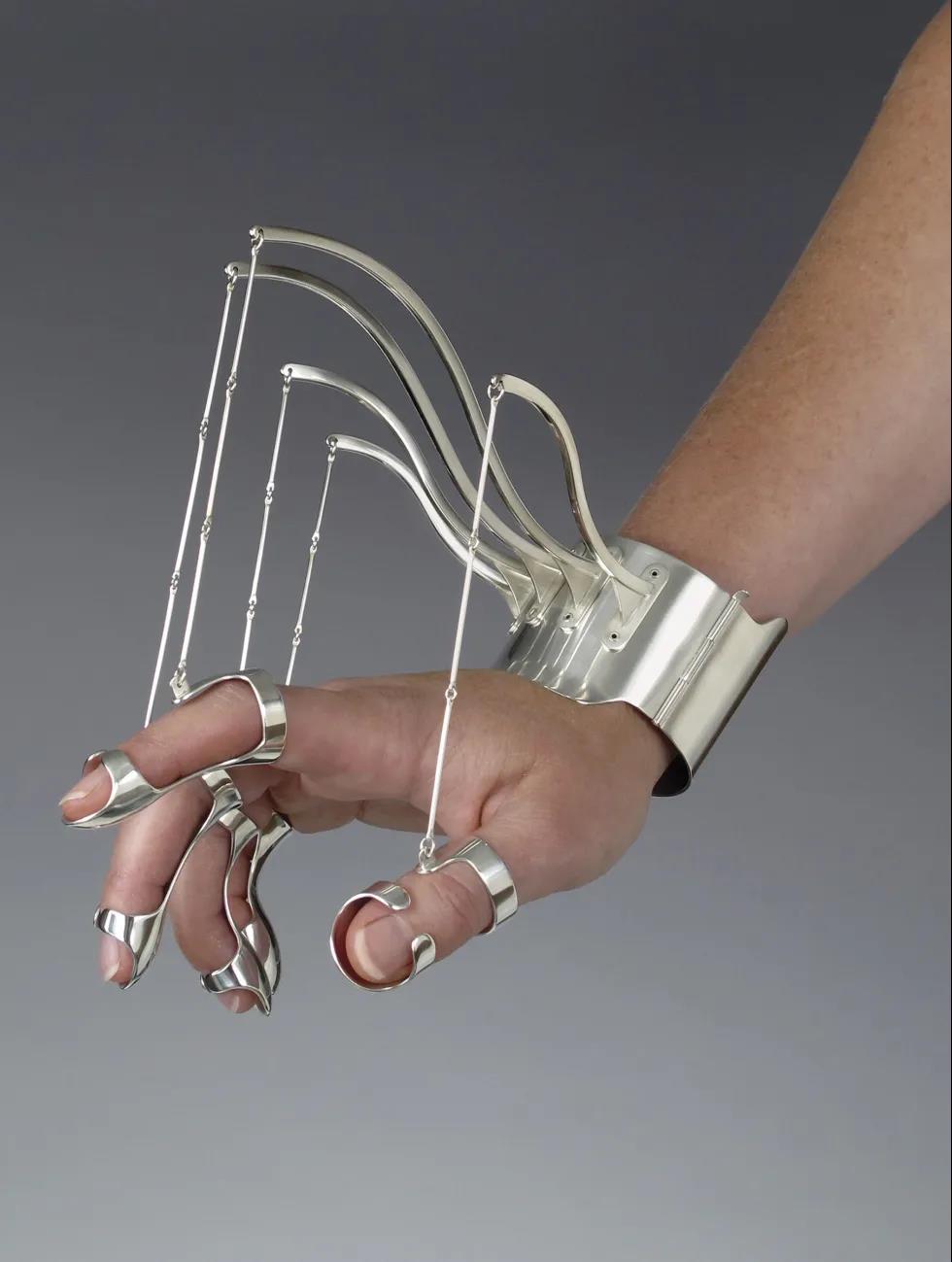 在她的系列作品《Ornamental Hands》中,手與鋁或純銀制的結(jié)構(gòu)性金屬附件擺出了多種形態(tài),在傳統(tǒng)藝術(shù)歷史繪畫中常能找到這樣的形式。