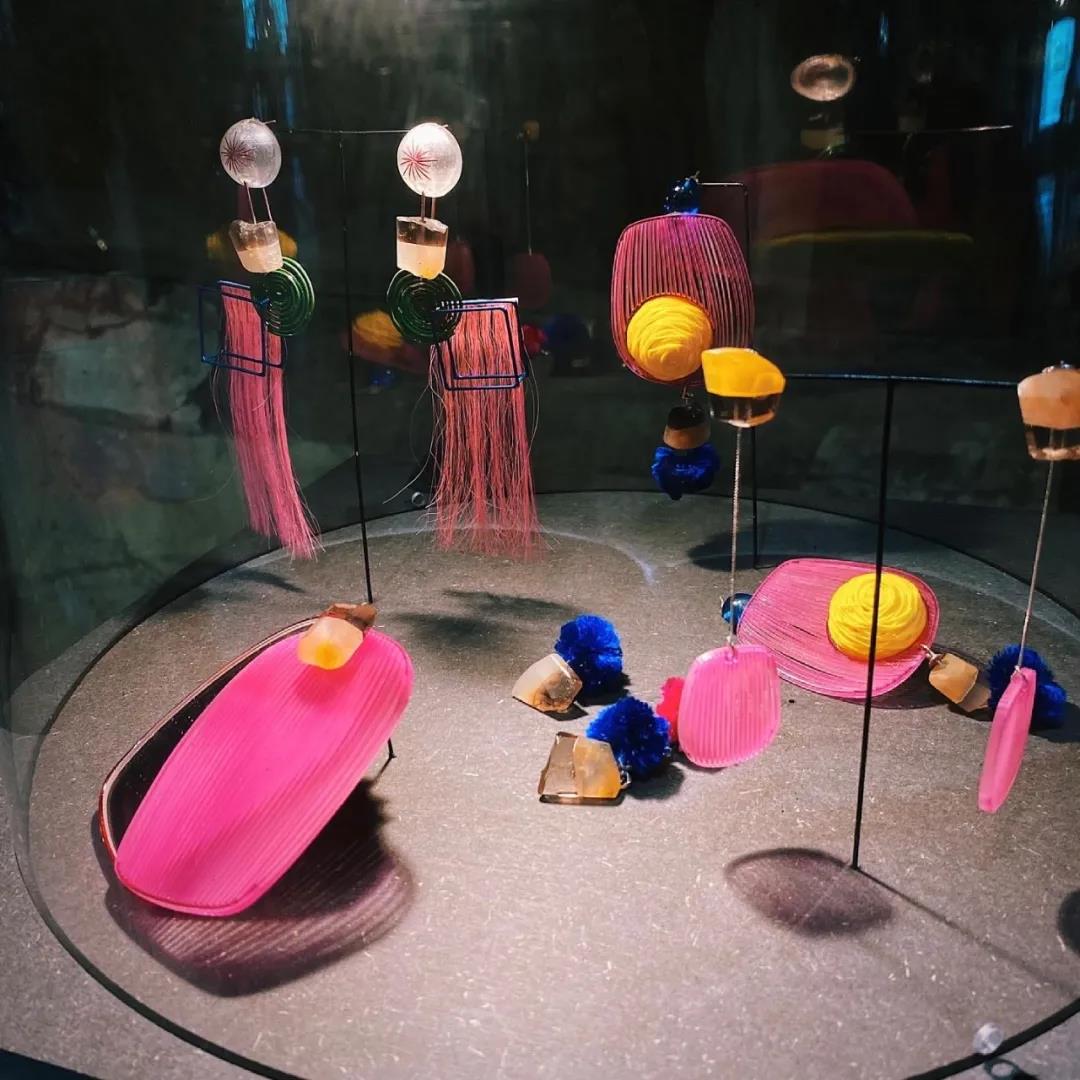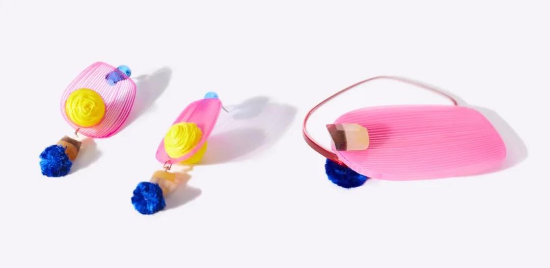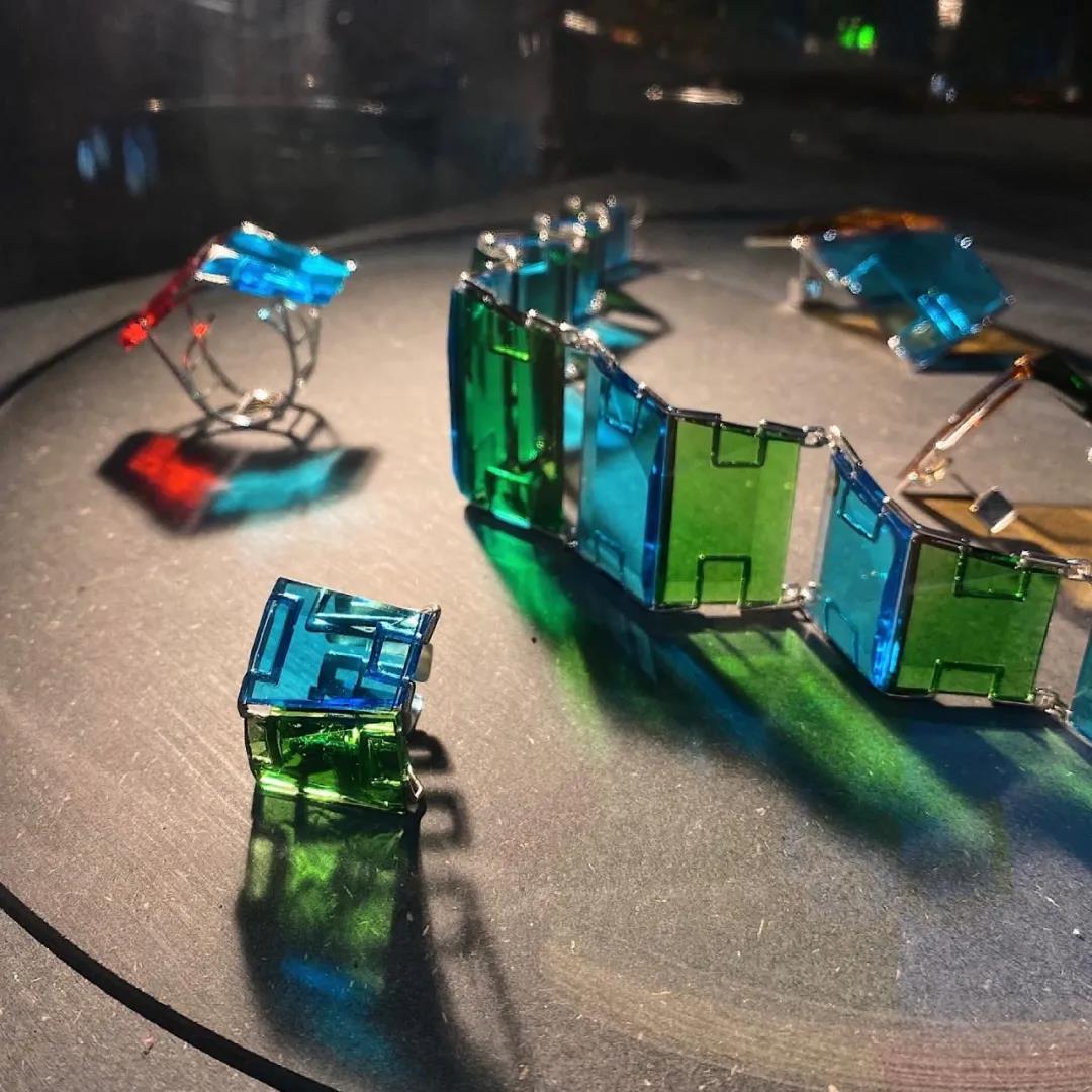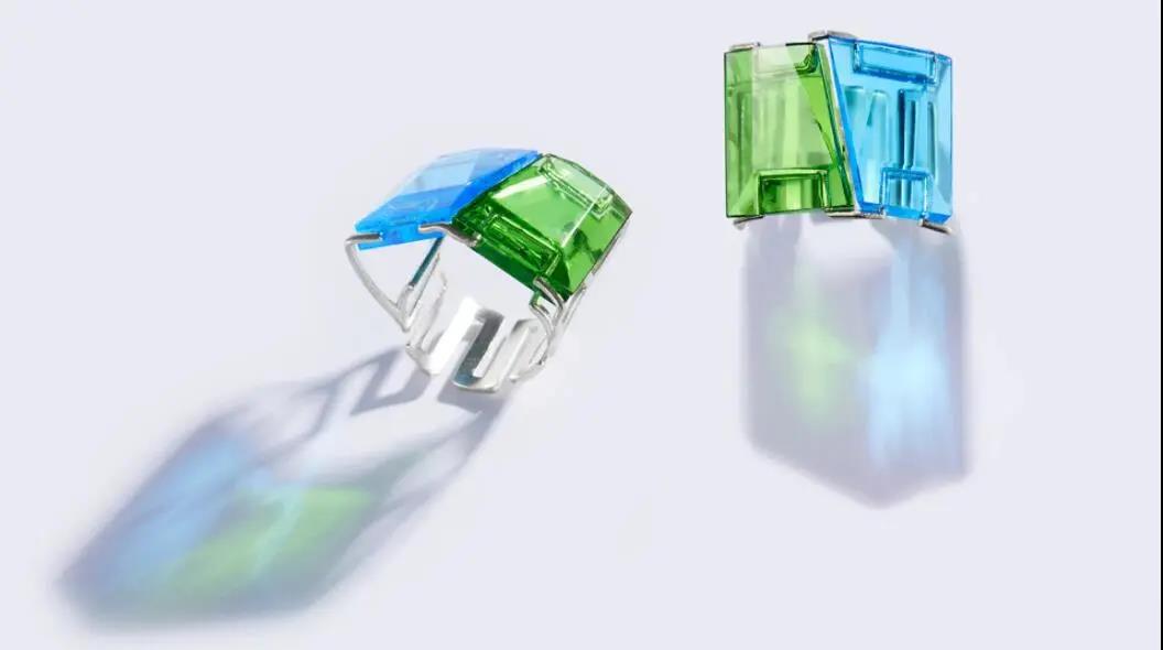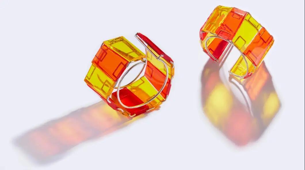 從活力耀眼的紅與黃,到平靜放松的藍與綠,每一件首飾都在觀者眼前構(gòu)成了一幅生動的想象圖景:日出,海灘,春天,草坪…… 當藍與黃交織時,若隱若現(xiàn)的綠色在耳邊浮現(xiàn),不禁讓人聯(lián)想起夏日清涼的雞尾酒。伴隨著光影變幻和色彩嬉戲,首飾所創(chuàng)造的互動空間微妙地影響著人們的情感體驗。
