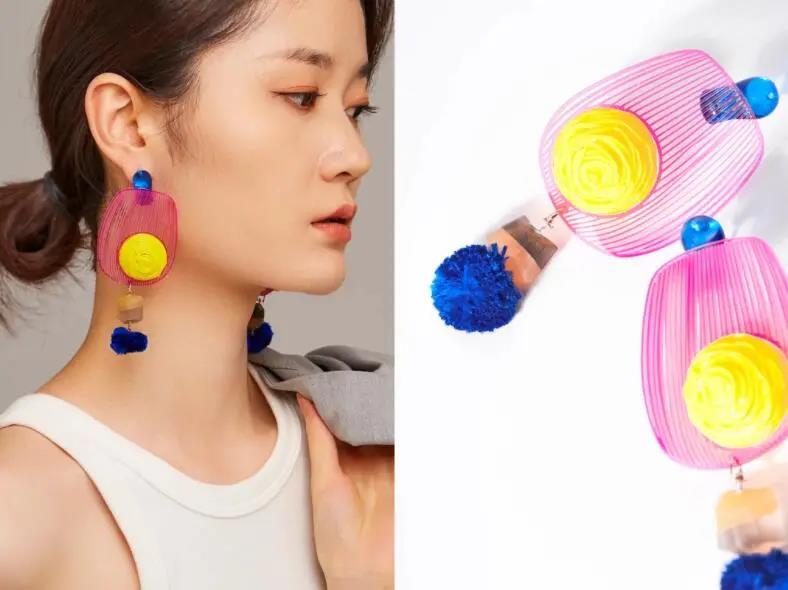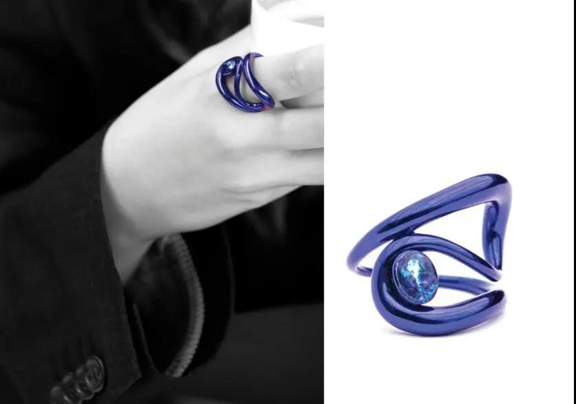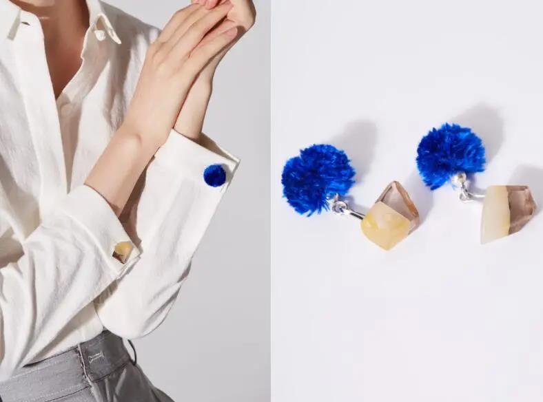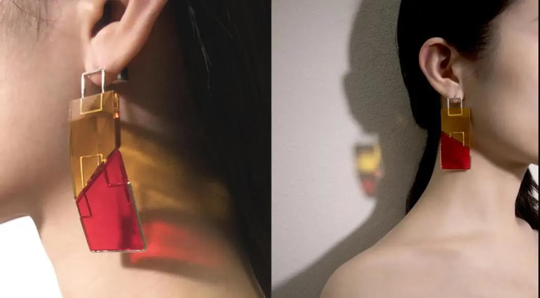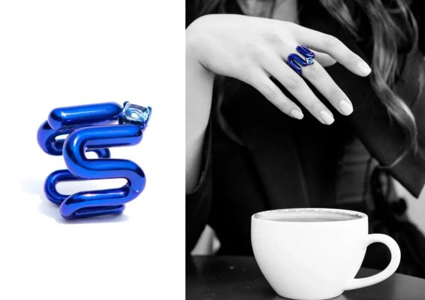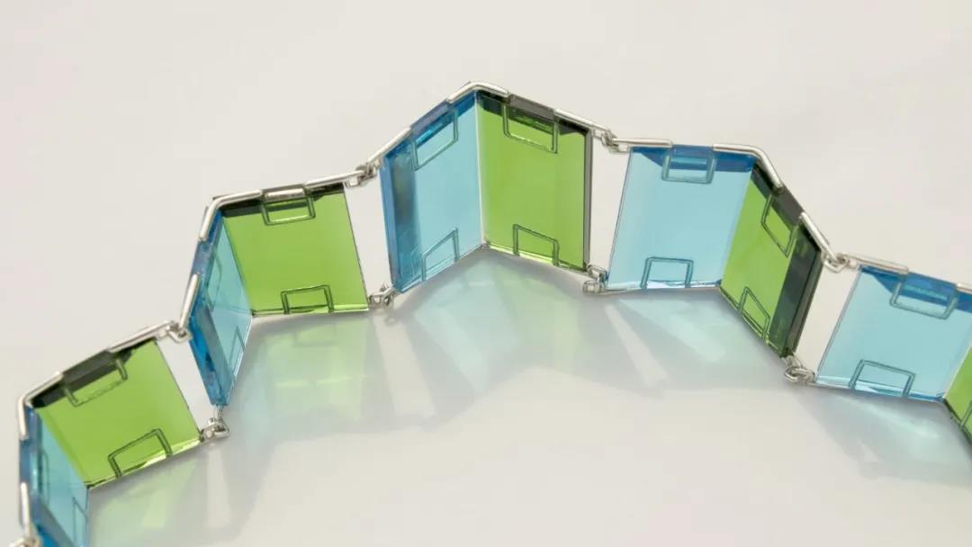 從活力耀眼的紅與黃,到平靜放松的藍與綠,每一件首飾都在觀者眼前構(gòu)成了一幅生動的想象圖景:日出,海灘,春天,草坪…… 當藍與黃交織時,若隱若現(xiàn)的綠色在耳邊浮現(xiàn),不禁讓人聯(lián)想起夏日清涼的雞尾酒。伴隨著光影變幻和色彩嬉戲,首飾所創(chuàng)造的互動空間微妙地影響著人們的情感體驗。