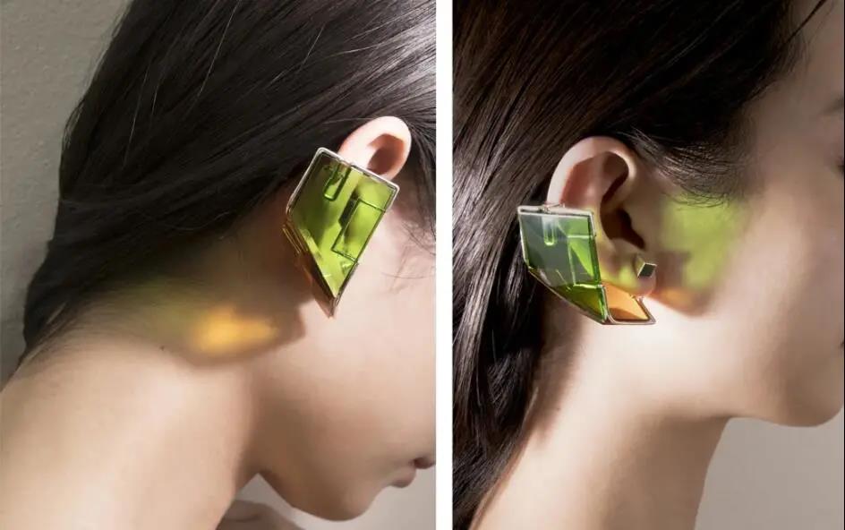 為了最大限度地讓光線透過玻璃,Xinyi 將幾何形狀的玻璃片巧妙地固定在了金屬框架上,兩片相鄰的彩色玻璃像折疊紙一樣形成了拱形的角度,在玻璃和佩戴者的皮膚上勾勒出交疊的色彩與光影,給予了細膩而豐富的視覺力量和情感提升。