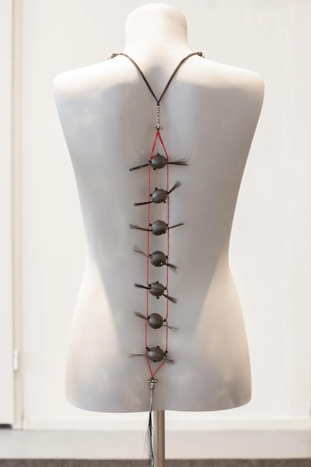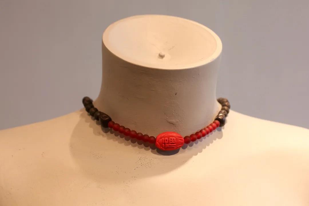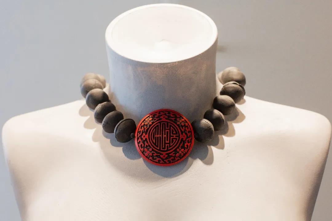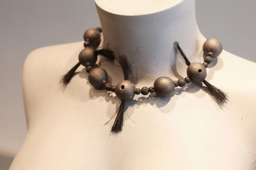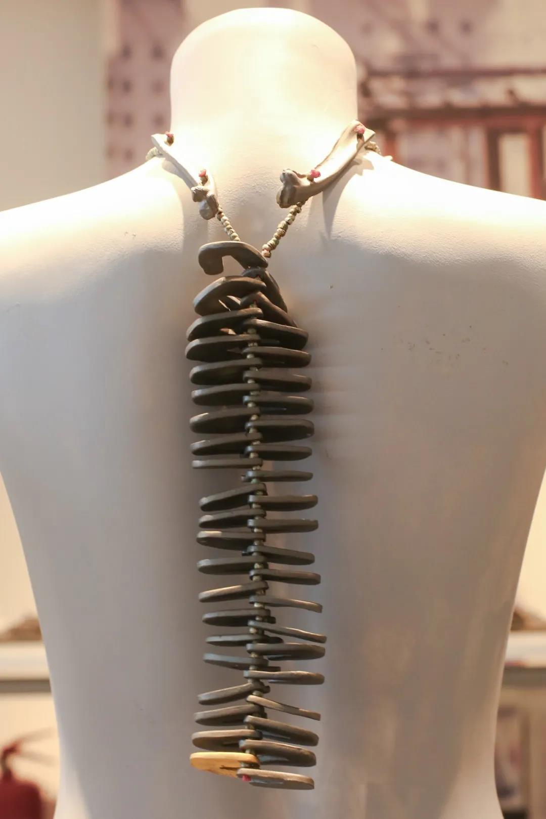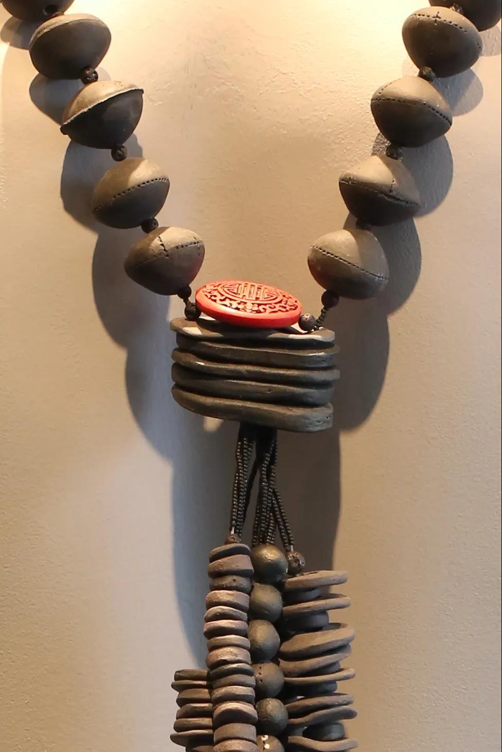大型的背部首飾是本次展覽的主線。Karin 做了14件由黑色瓷珠,骨頭和物件組成的大型背部首飾,與護(hù)身符,馬毛和自然材料相結(jié)合。她在中國(guó)的陶瓷之鄉(xiāng)景德鎮(zhèn)制作瓷器串飾。中國(guó)的歷史文化對(duì)Karin的作品有深厚的影響。許多中國(guó)元素被融入其中,如硬幣、漢字和紅色元素。