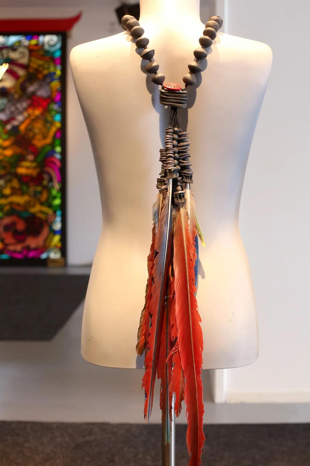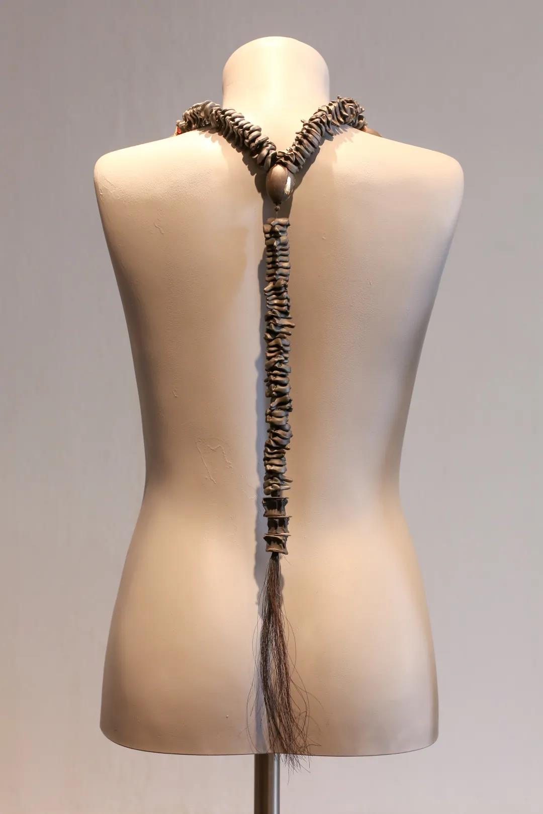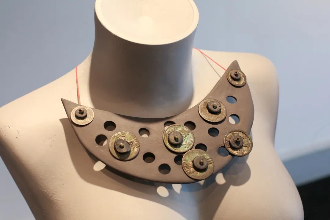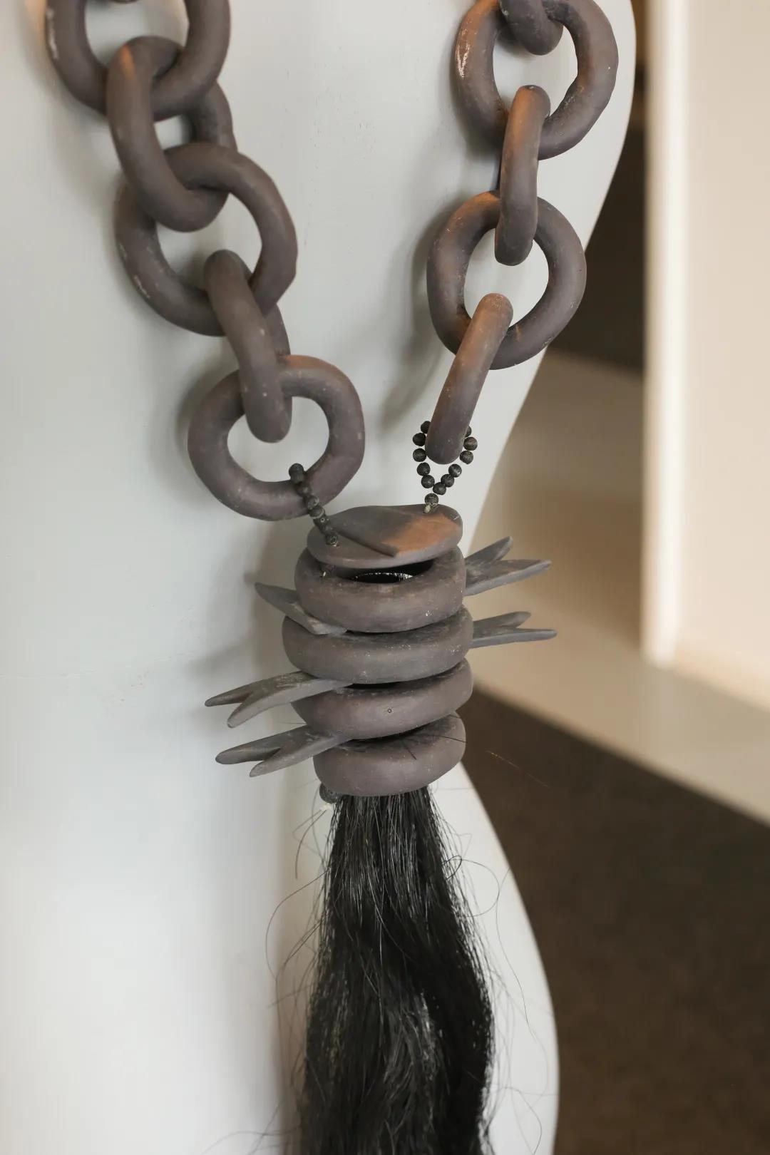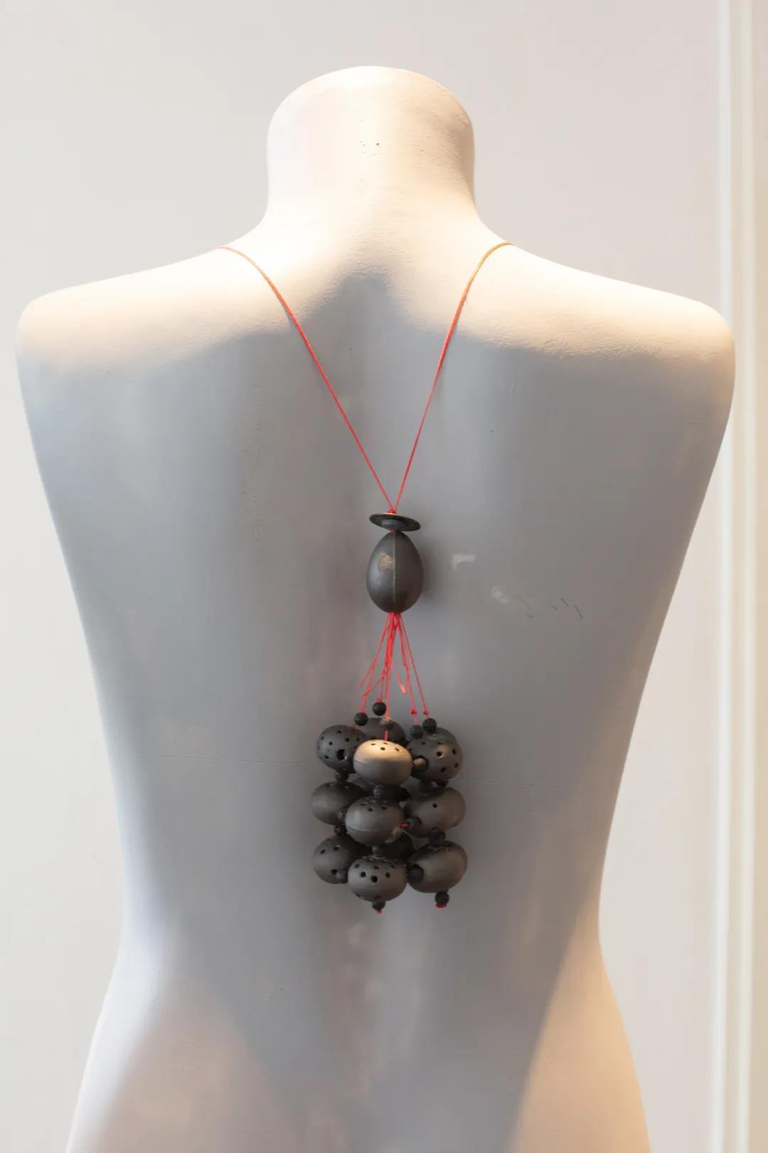 大型的背部首飾是本次展覽的主線。Karin 做了14件由黑色瓷珠,骨頭和物件組成的大型背部首飾,與護(hù)身符,馬毛和自然材料相結(jié)合。她在中國(guó)的陶瓷之鄉(xiāng)景德鎮(zhèn)制作瓷器串飾。中國(guó)的歷史文化對(duì)Karin的作品有深厚的影響。許多中國(guó)元素被融入其中,如硬幣、漢字和紅色元素。