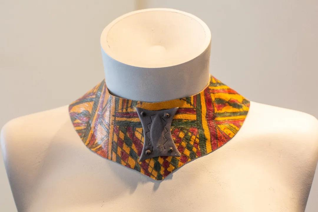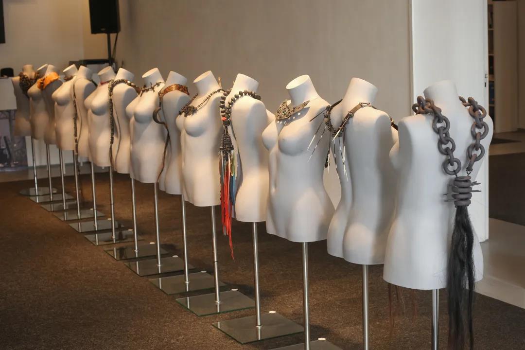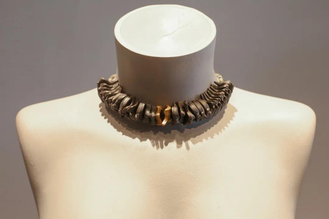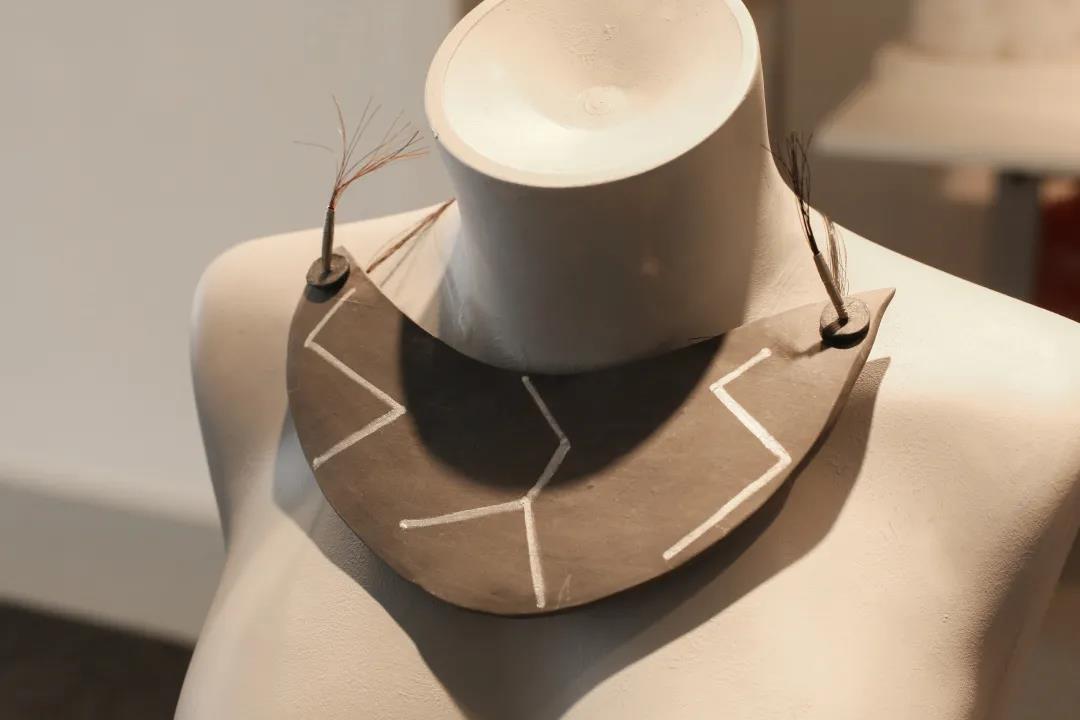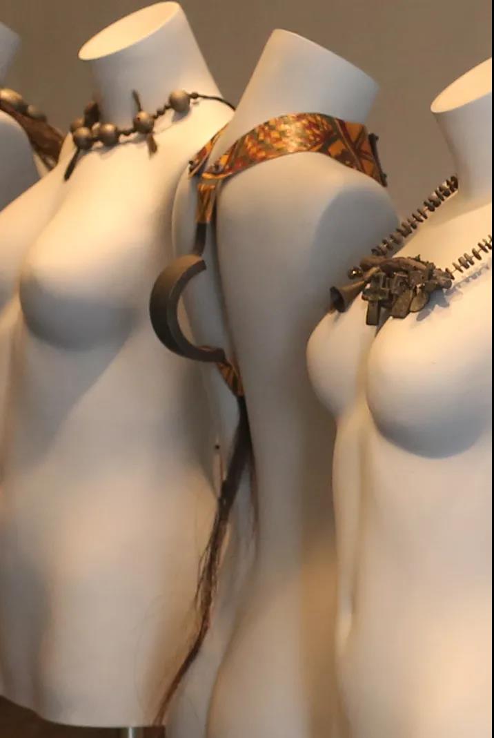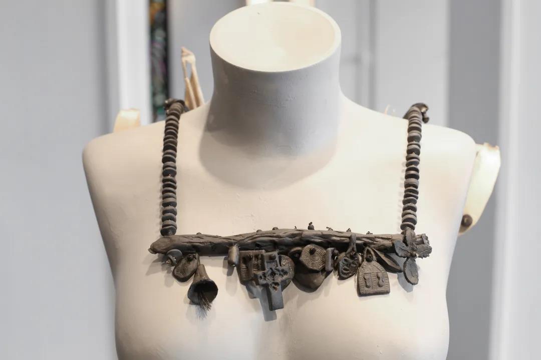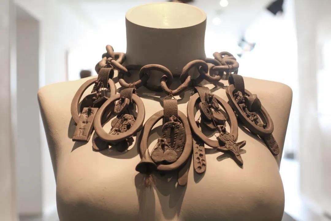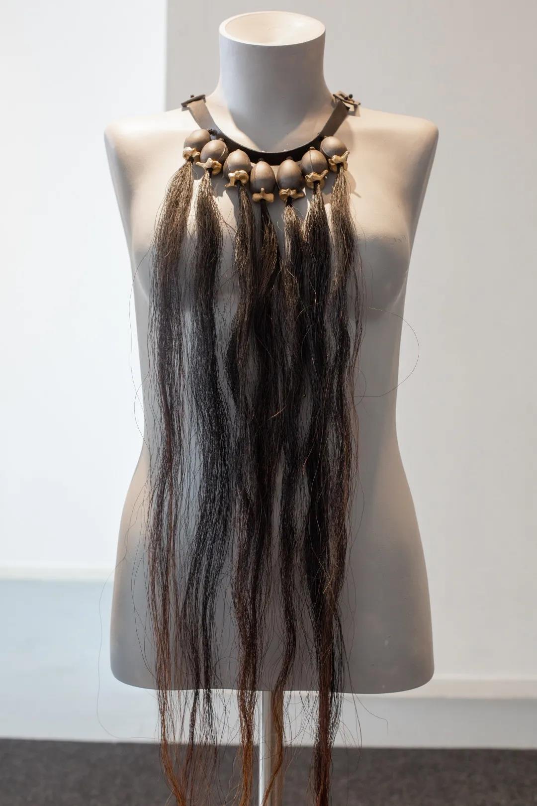 大型的背部首飾是本次展覽的主線。Karin 做了14件由黑色瓷珠,骨頭和物件組成的大型背部首飾,與護(hù)身符,馬毛和自然材料相結(jié)合。她在中國(guó)的陶瓷之鄉(xiāng)景德鎮(zhèn)制作瓷器串飾。中國(guó)的歷史文化對(duì)Karin的作品有深厚的影響。許多中國(guó)元素被融入其中,如硬幣、漢字和紅色元素。