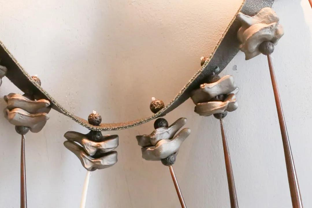 Karin: 而這個(gè)(位于背部卷曲的陶瓷圓環(huán))象征著我已去世的兄弟的頭發(fā)。他有著像非洲人一樣細(xì)小的卷發(fā)。我們所有人和他緊緊相連。因?yàn)槲姨矚g這件作品了,所以我想在這次展覽中展示它。
