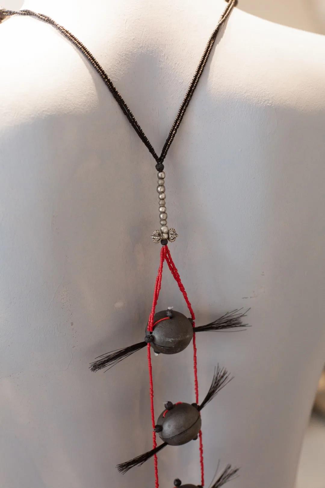 The large back jewelry forms the backbone of the exhibition. Karin has made 14 large back jewelry with black porcelain beads, bones and objects, combined with charms, horsehair and natural materials. She makes the porcelain charms in the Chinese porcelain city Jingdezhen. The history and culture of China has a lot of influence on her work. Many Chinese elements have been incorporated, such as coins, characters and red accents.