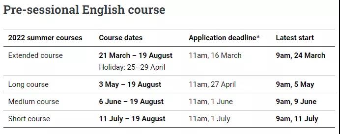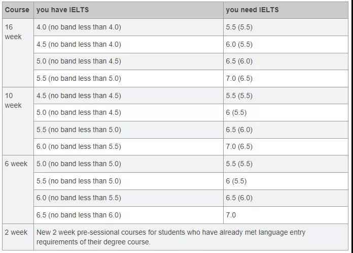 語言班,一般稱為Pre-sessional English,幫助沒有滿足本科或碩士雅思要求的學生在完成語言班學習后可以繼續(xù)本科或碩士課程。根據學生當前英語水平,以及與所就讀專業(yè)要求之間的差距,提供不同時間長度的課程,短則2-6周,長到20-35周不等。