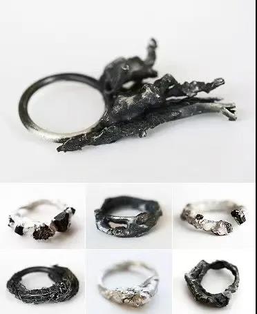 這種肌理效果往往具有出其不意的美感,它的形成真可謂“謀事在人、成事在天”。鑄造工藝肌理的偶然性特征留給了人們無限的發(fā)揮空間。當下很多首飾設計作品呈現(xiàn)出鑄造肌理的偶然性審美特征,這種審美特征結(jié)合首飾作品的造型、結(jié)構(gòu)、材料以及作者的思考與情緒,表達著一個個故事,一段段情感體驗。