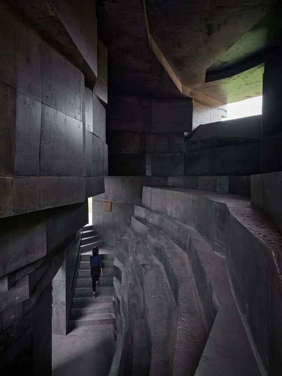 建筑的形態是對場地的直接回應:上大下小的倒錐形的結構,既順應著山谷的形態,也以最小的足跡輕輕地落在山谷底部,將對周邊環境的影響降到最少。同時,它也是音樂廳內部階梯狀觀眾席的外在表達。