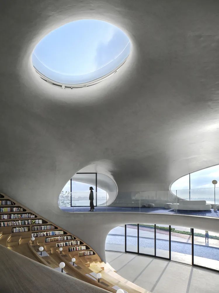 云洞圖書館地處海口灣畔的世紀公園,包含書館和市民活動配套。洞型空間的層次和復雜性將空間一層層拉開,讓人們從熟悉的城市現實走近建筑,開啟一段新的時空之旅,也提供給讀者一個想象力的失重場。
