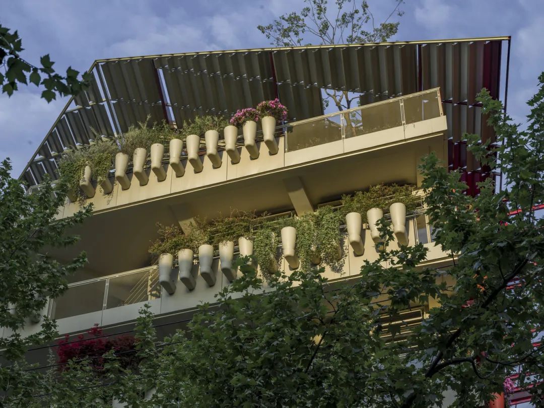 建筑在完美嵌入局部都市肌理的同時,以米黃色的外立面限定出了馬當路和淡水路的兩個入口。市民可以借此窺見內部的獨特光線和色彩,以及茂密蔥郁的植被。兩層的商業店鋪由數座小橋和道路相連,并被兩堵特制的花墻所圍繞。花墻上是種有不同植物的紅罐,營造了一個色彩豐富的環境。