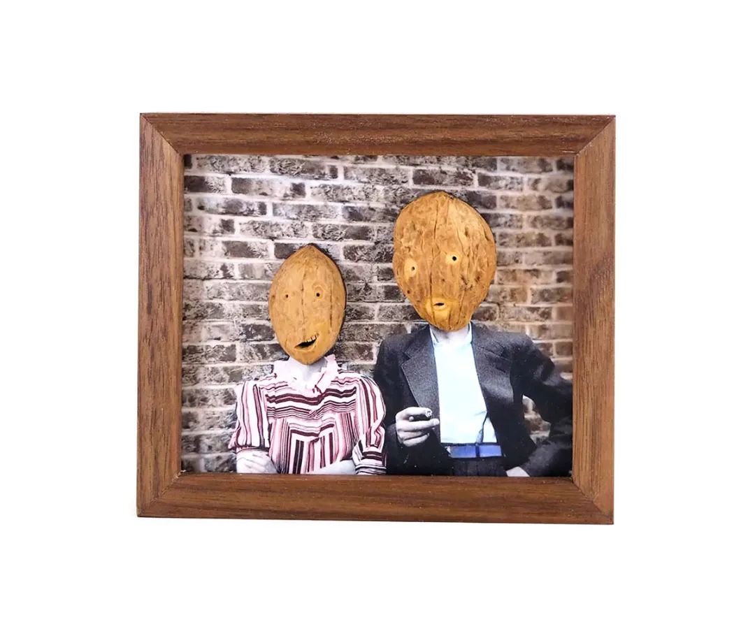 Hartog & HennemanBrooch: Are you Nuts, 2021Walnut, wood, steel, magnet.approx. 20 x 15 cmPhoto by: Jiska Hartog, Michiel HennemanBrooches on photo in walnut frame (handmade).Unique piece