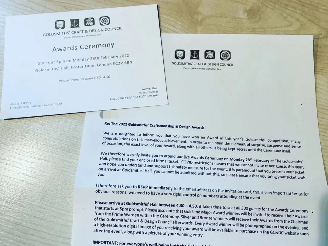 因為英國徹底解封了,今年的頒獎典禮是線下舉行的,但是只允許獲獎者本人參加。因為獲獎的作品是在BCU珠寶學院讀碩士的時候做的,學院贊助了往返的車票并且組隊前往倫敦。
