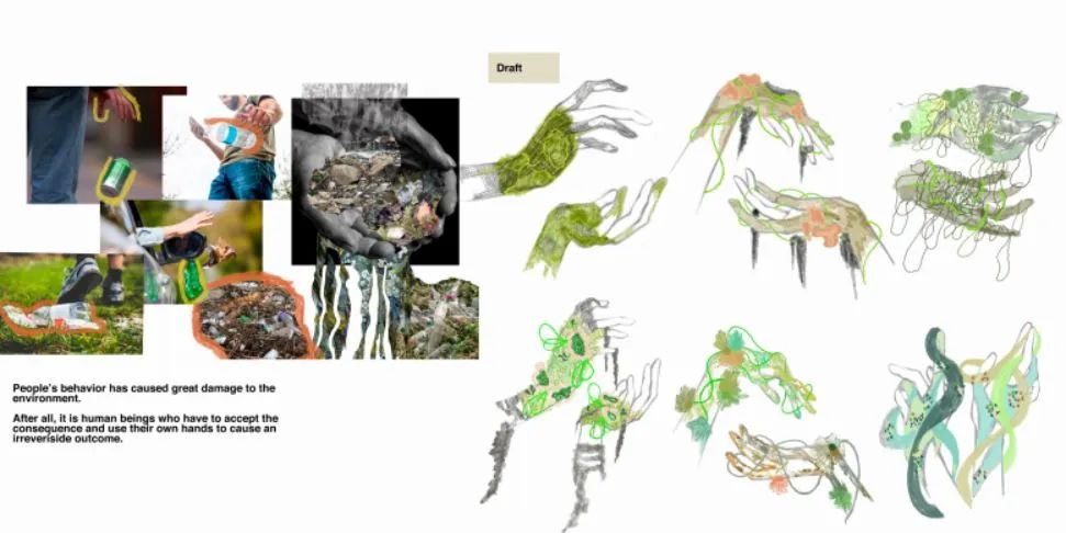 我用塑料材質(zhì)(塑料管、泡泡紙)、金素材質(zhì)和網(wǎng)狀材料來代表污染物,給他們?nèi)旧靡恍┟€、碎布、紗線、毛氈來表現(xiàn)植物的質(zhì)感,將這兩種反差很大的材質(zhì)通過編織、縫線等等的方式結合到一起,來體現(xiàn)我的主題,污染和自然環(huán)境互相滲透。