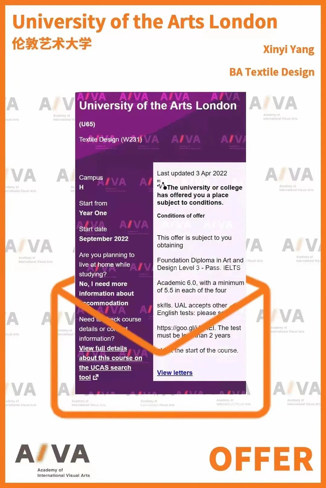 上周四,AIVA本科預科服裝專業(yè)學生Xinyi參加了UAL線上面試,順利拿到了切爾西王牌專業(yè)——紡織設計的offer,讓AIVA所有老師都倍感激動!而更多的offer還在飛來中~