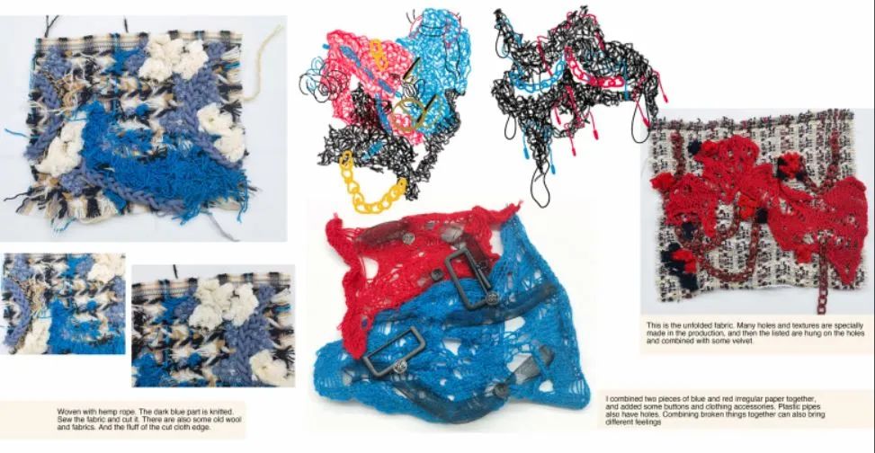 但是在服裝設計的預科學習中,我發(fā)現(xiàn)自己很喜歡面料改造這一個小part。我的動手能力比較強,本來就喜歡做一些奇奇怪怪的手工和實驗,所以覺得做面改就像玩一樣,愿意去嘗試很多方式,實驗很多次也不會覺得煩,我覺得面料設計非常非常適合我,也可能這就是熱愛吧,啊哈哈哈。