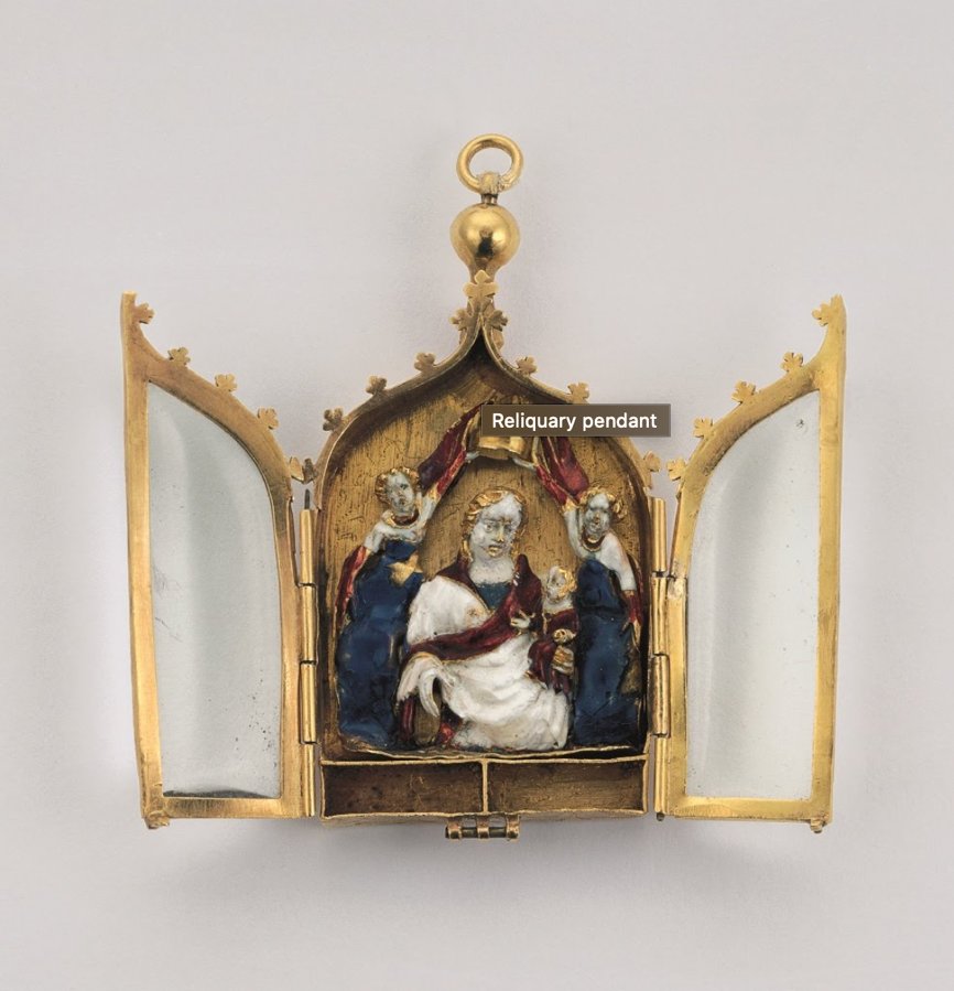 這件館藏的圣骨匣吊墜,我們就可以看到圣母瑪利亞與天使等主要形象上保留的鮮艷的琺瑯痕跡。圣骨匣打開之后可以看到內部精致的圣像,除了開合的門,在瑪利亞的下方還有兩個空心的方形結構與底部多出的合頁連接結構,應該構成類似抽屜的空間用于圣物的放置。但這部分已經不復存在了。