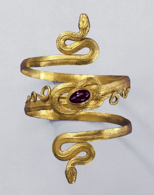 這個漂亮的黃金臂環,由兩條尾部交疊的蛇組成主體部分,并在中間呈海格力斯接紐造型(Heracles knot),包鑲一顆巨大的石榴石,鑲口一圈以金珠粒裝飾。